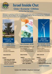 Living in Israel is an adventure, but do you truly know how the country works? Join us for Israel Inside Out, a practical and inspiring 3-part tour series designed designed for English speakers, new Olim, and international students.